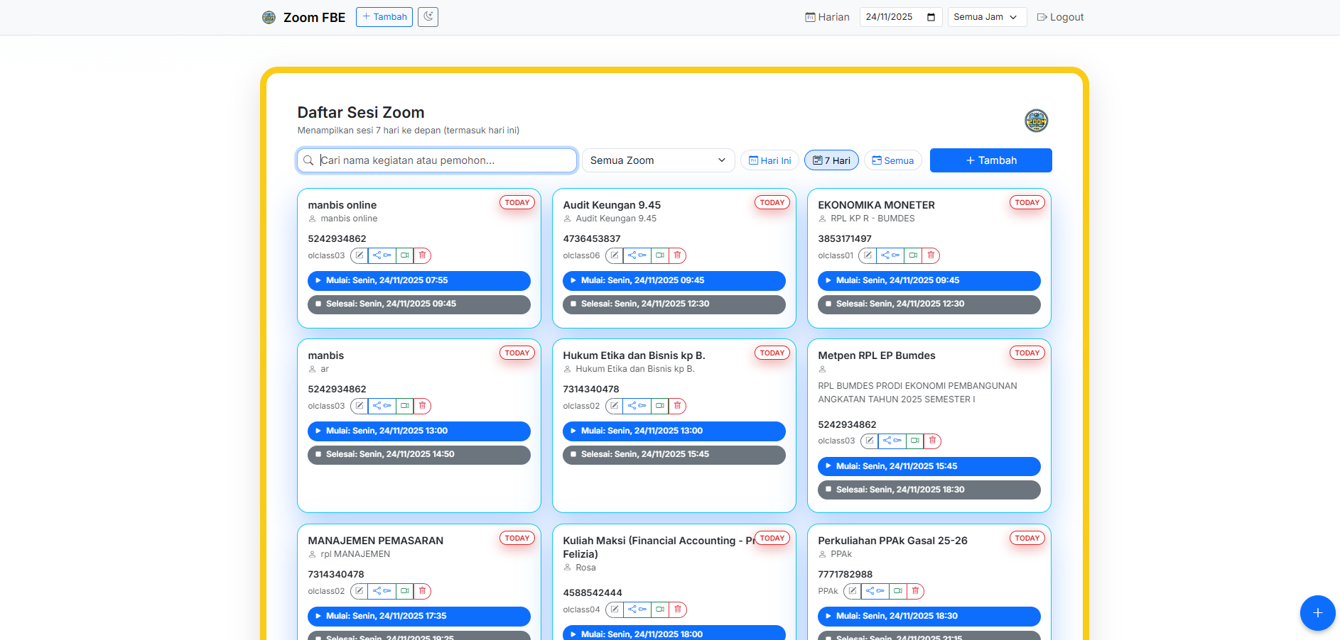 Aplikasi pengelolaan Zoom: jadwal, status, share link, dan deteksi jadwal bentrok....