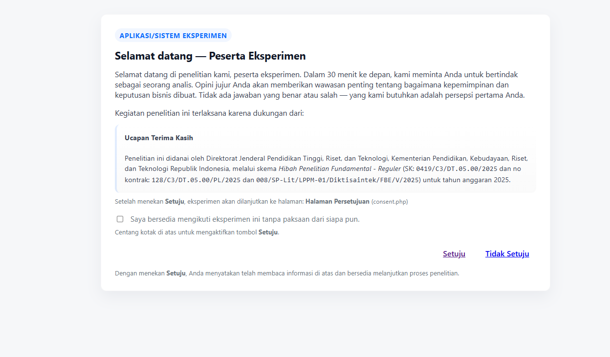 Platform eksperimen multi-step: narasi audio, randomisasi cell A/B/C/D, kuisioner, dan val...